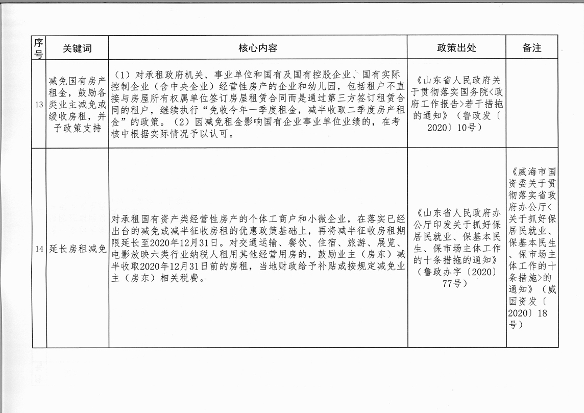 為全面落實“六穩(wěn)”、“六?!比蝿?wù),進一步推動國有企業(yè)房租減免政策落地落實,現(xiàn)將《受疫情影響2020年度房租減免等政策干貨匯總表》及監(jiān)督投訴電話予以公告。
